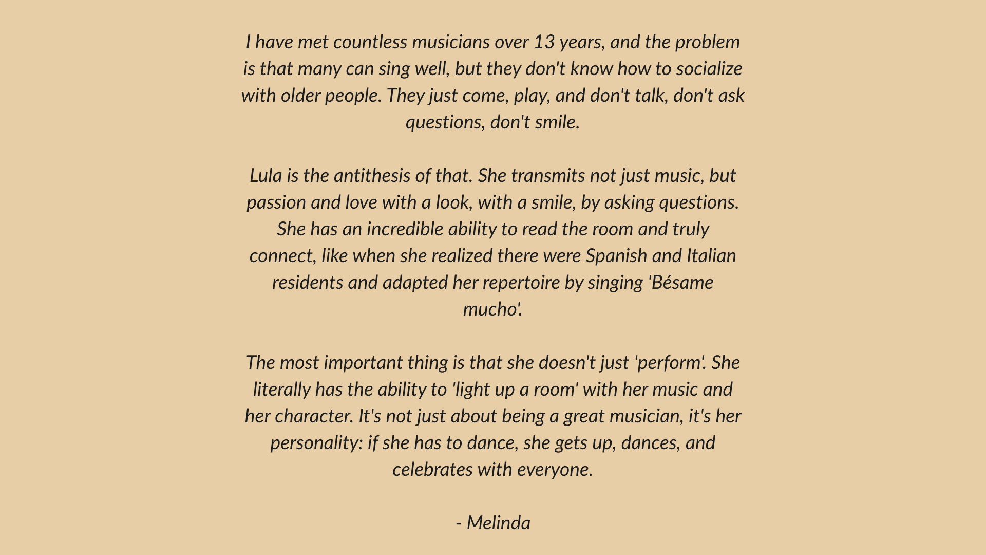Whether you need an intimate serenade or a lively party atmosphere, we have the perfect ensemble size for you. They work beautifully as regular weekday engagement activities, but are also perfect for elevating special occasions such as resident birthdays, anniversaries, or upcoming festive gatherings.